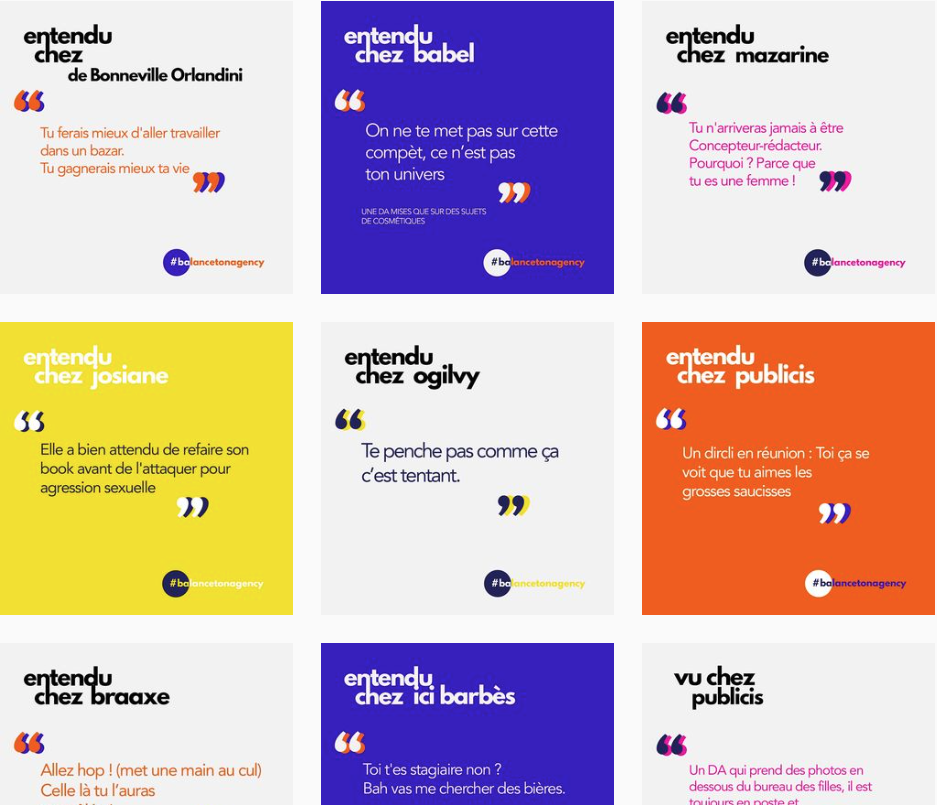 Elle intègre une autre agence, plus petite, avec l’espoir d’y être mieux accueillie et respectée. Raté. Cela fut bien pire. On l’aurait recruté au physique car son chef fonctionne ainsi d’après certaines rumeurs. Les employé·es seraient constamment surveillé·es. Ses journées, alors rythmées par des “Je vais te cramer si tu te plains” ou “Si tu fais chier, ta carrière est finie”, l’ont conduite à un burn-out total. C’est comme cela qu’elle crée un matin le compte Instagram @Balancetonagency. L’objectif ? Sur le modèle du hashtag Balance ton porc qui visait les agresseurs et violeurs, les victimes de harcèlement physique ou morale peuvent témoigner anonymement afin de dénoncer mais également d’informer les salarié·es de la pub des pratiques qui ont cours en interne.