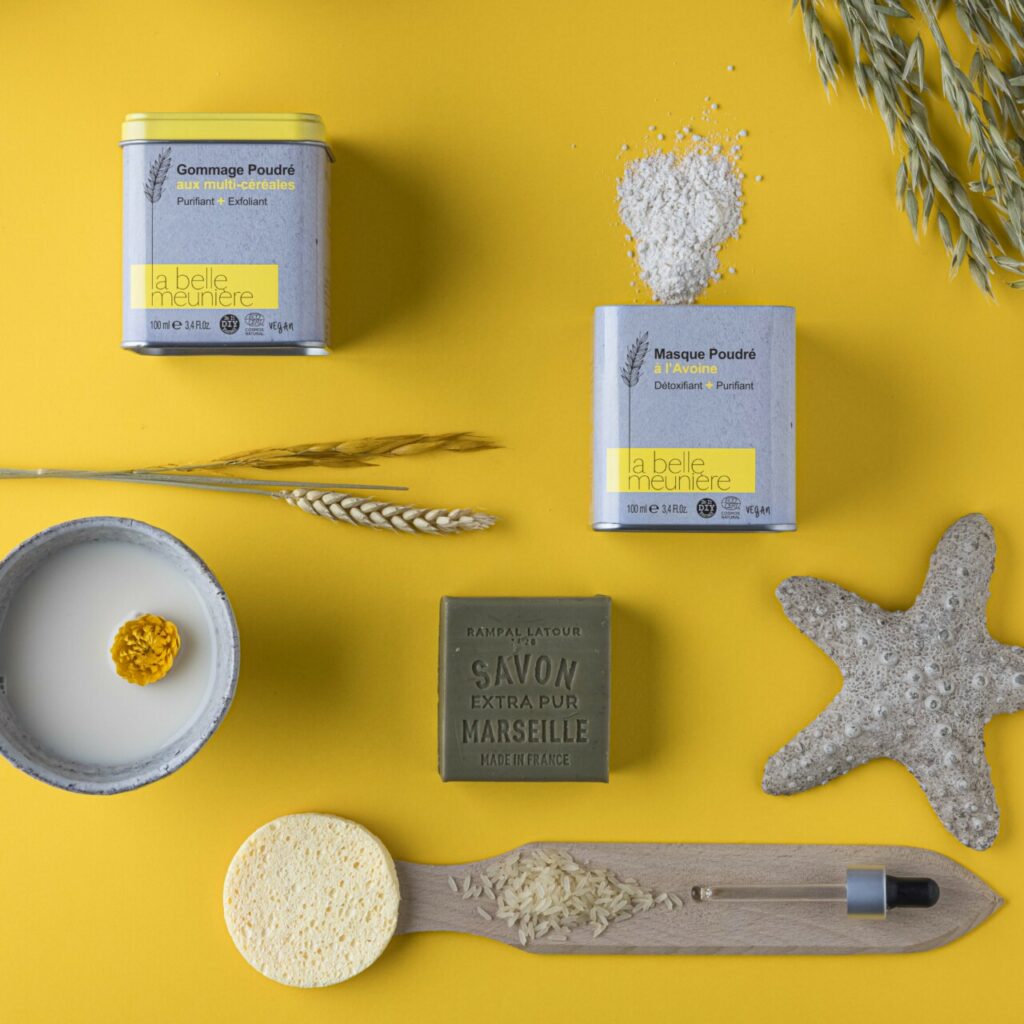 Les marques de cosmétiques sont de plus en plus nombreuses à exploiter les pouvoirs des céréales, les intégrant progressivement dans leurs formules. Certaines en ont même fait leur ADN. C’est le cas de La Belle Meunière, qui se revendique comme la première ligne de soins cosmétiques aux céréales issues de l’agriculture biologique française. Du masque au gommage en passant par le soin hydratant, le sérum éclat, ou l’huile démaquillante, la marque propose tout le nécessaire pour une routine complète avec la possibilité, pour certains produits, de les réaliser soi-même en mode DIY. Le tout garanti naturel, végan, made in France, et 100% transparent.