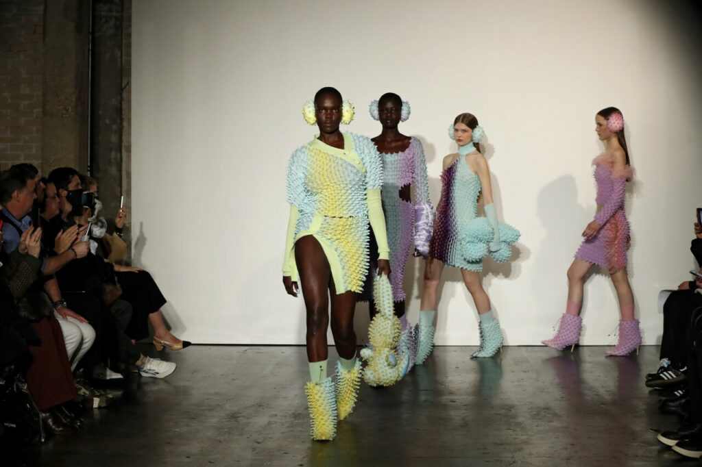 La marque britannique Poster Girl, connue pour ses robes ultra-révélatrices portées par des célébrités comme Kylie Jenner et Dua Lipa, a fait son premier défilé sur le thème de l’après-ski, avec des pièces couleur néon, comme des manteaux bouffants ornés de fausse fourrure. Encore plus minimaliste, la jeune créatrice albanaise Nensi Dojaka s’est fait remarquer pour ses robes à ficelles évoquant des pièces de lingerie.