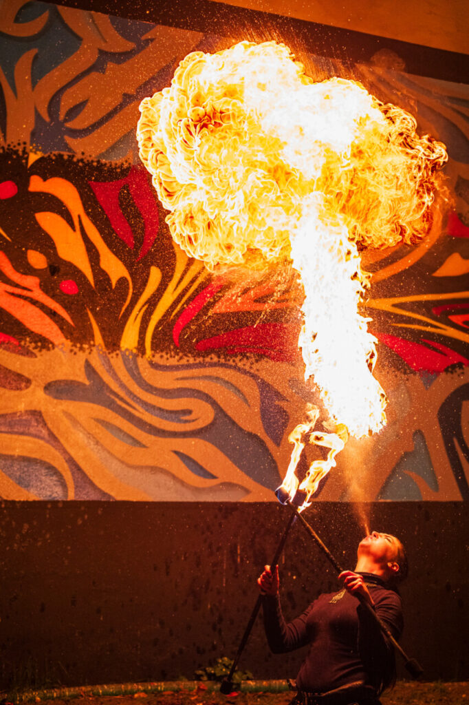Pour le vernissage de cette fresque, l’équipe autour des artistes urbains Sader et Stick, membres du Comité d’art urbain de la Ville de Luxembourg, avait prévu cette fois quelque chose de très spécial, le public a pu admirer un spectacle de feu qui a eu un effet très particulier devant la fresque nouvellement créée et compte tenu de l’obscurité hivernale.