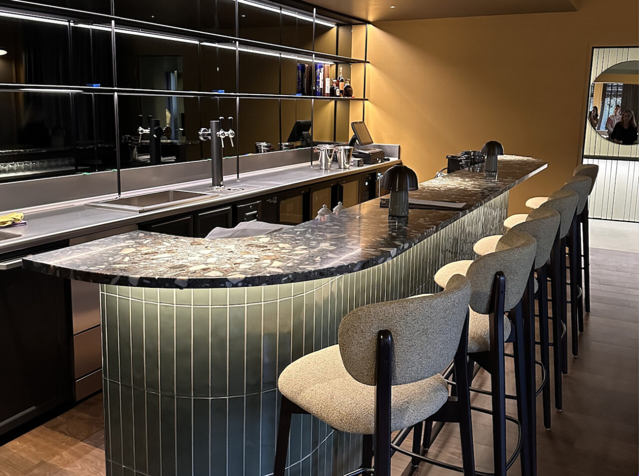 L’intérieur a été totalement transformé et présente désormais plusieurs espaces à l’atmosphère élégante et conviviale. La grande salle, baignée de lumière, impressionne par ses volumes et son coin cheminée, offre un espace modulable pouvant accueillir 80 convives pour un dîner assis ou 150 personnes pour un cocktail. La salle jaune, teintée d’un charme vintage aux touches arty avec son bar privé et ses détails subtils, accueille jusqu’à 50 invités dans un cadre intime parfait pour les moments en petit comité. Quant au salon, adjacent à la salle jaune, il peut être privatisé pour des réceptions plus intimistes encore.