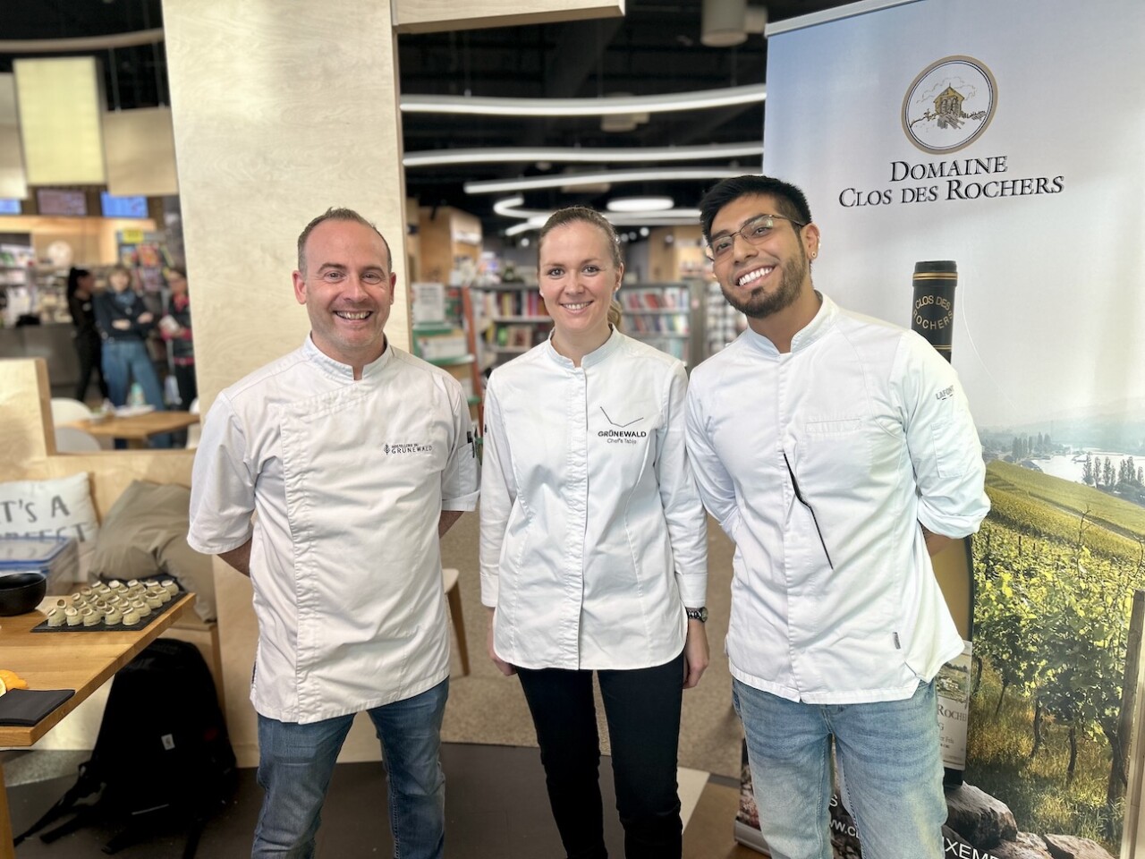 Et à l’occasion de cette première édition de 2024, il est peu dire que le décor était pour le moins original : le café de la librairie Ernster, au Cloche d’Or Shopping Center. Le but ? Pouvoir cette fois proposer une approche plus « live cooking » et faire le lien avec la grande tendance des beaux livres de cuisine. Il faut croire que la promesse était alléchante : plus de 50 personnes se sont déplacées pour goûter les créations des chefs, et notamment des trois nouveaux membres de l’association : Jersson Olivares du Restaurant Clairefontaine et le duo du Grünewald, Pauline Michelin de la Chef’s Table et Bruno Fabbian de l’Hostellerie.
